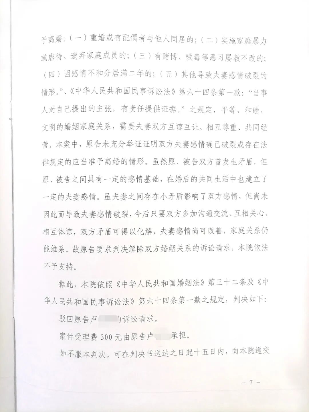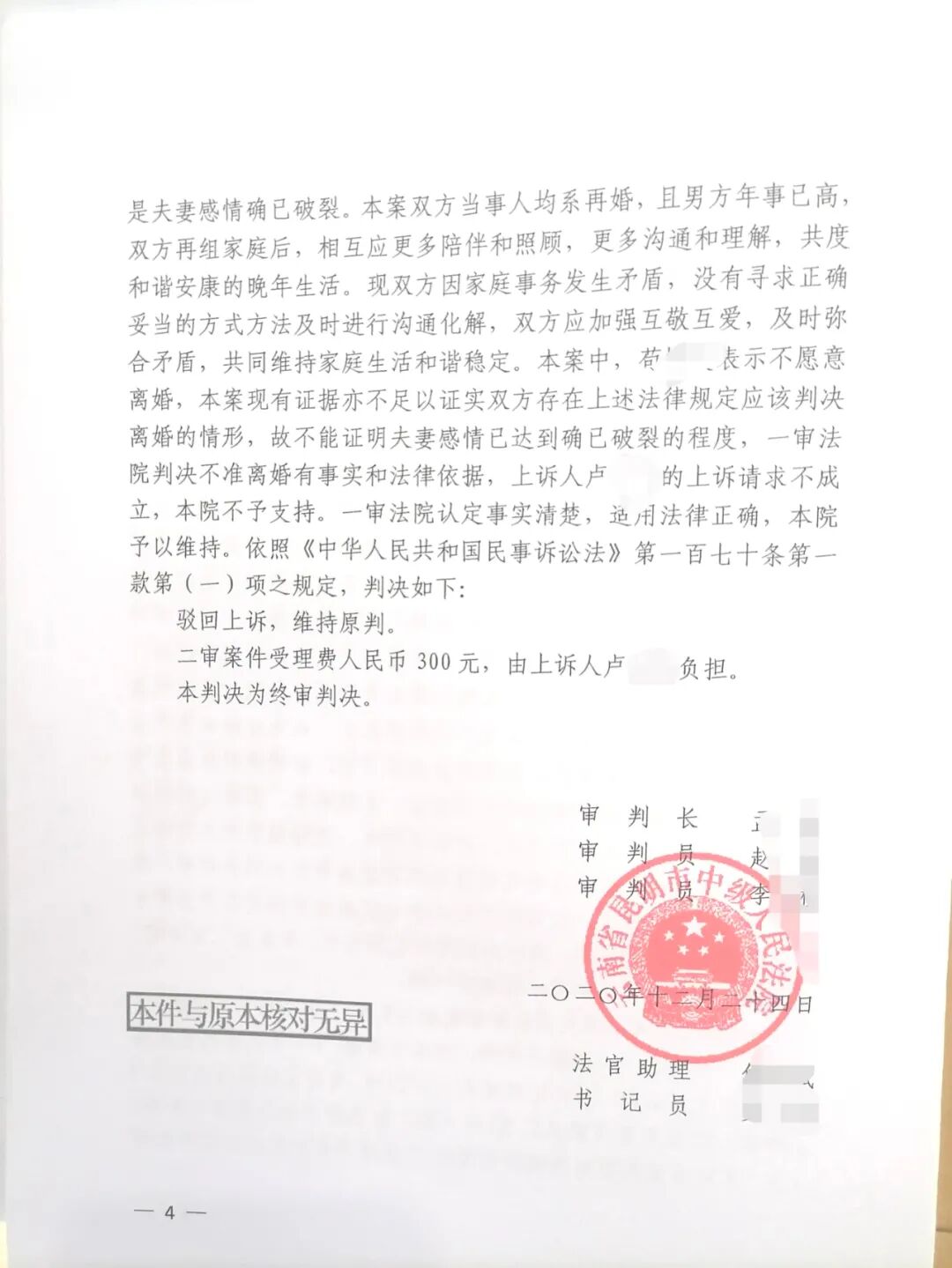 2021年7月,距离昆明市中级人民法院的判决已经超过6个月,根据《民事诉讼法》的规定,可以第二次提起诉讼。林启凤律师及时告知卢某某可以再次起诉,卢某某为了能够早日摆脱这段婚姻,表示自愿放弃其他诉讼请求,只求与苟某某离婚,这是他生前的唯一愿望。林启凤律师根据卢某某的意愿,书写了诉状,于2021年7月8日向官渡区人民法院立案,后经官渡区人民法院审理,审理法官主持调解,但鉴于苟某某还是坚决不同意离婚,本案开庭审理,庭审中林启凤律师提出卢某某与苟某某感情已破裂,且无任何和好可能,根据《民法典》1079条“ 人民法院审理离婚案件,应当进行调解;如果感情确已破裂,调解无效的,应当准予离婚。 有下列情形之一,调解无效的,应当准予离婚:(一)重婚或者与他人同居;(二)实施家庭暴力或者虐待、遗弃家庭成员;(三)有赌博、吸毒等恶习屡教不改;(四)因感情不和分居满二年;(五)其他导致夫妻感情破裂的情形。一方被宣告失踪,另一方提起离婚诉讼的,应当准予离婚。经人民法院判决不准离婚后,双方又分居满一年,一方再次提起离婚诉讼的,应当准予离婚。”之规定,应当判决双方离婚,经过漫长的等待,终于官渡区人民法院于2021年11月26日作出判决:判决卢某某与苟某某离婚。林启凤律师第一时间将判决结果告知卢某某,卢某某听到判决离婚的这个结果满心欢喜,激动的说到:“感谢林律师的帮助,也感谢司法局领导的关心,我的心愿终于达成了,死而遗憾了。”前后经历了两年多的时间,三次诉讼,卢某某终于彻底摆脱了这段不幸的婚姻,只是这条离婚之路走得艰辛,但结局是卢某某想要的,也许对卢某某来说:离婚是一种结束,也是一种开始,更是生命的一次重生。
