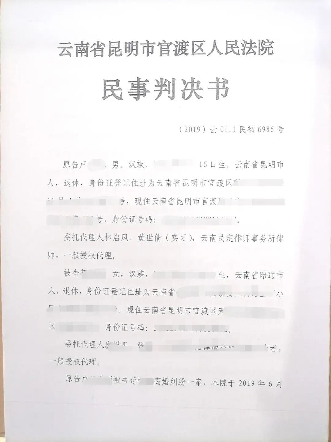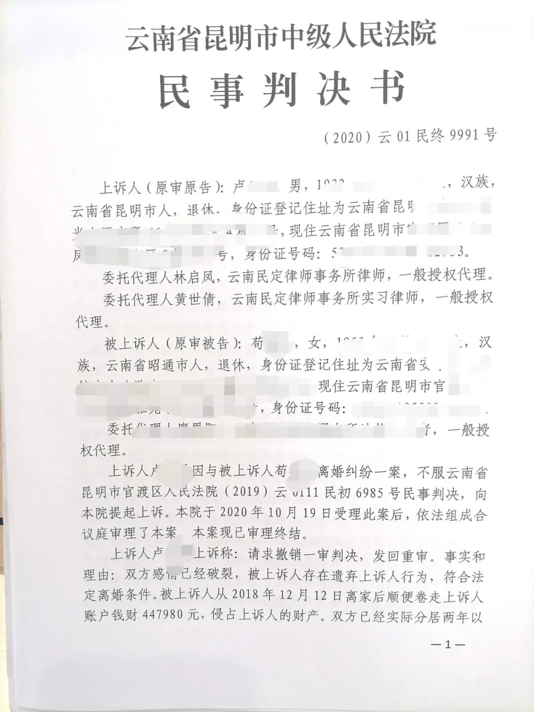 林启凤律师接下这个案件后,向卢某某了解了双方认识、交往、婚后的生活情况后,为了能够最大程度维护卢某某的合法权益,林启凤律师多次往返多家银行为卢某某查询银行卡流水,并多次前往卢某某单位及其他单位、个人为卢某某收集证据。找到相关证人了解情况,在经过细致的整理分析后,鉴于卢某某之前提交的诉讼请求不完善,林启凤律师在取得卢某某同意后,及时向官渡区人民法院申请了变更诉讼请求及增加事实理由。为了能够更快帮助卢某某摆脱这段不幸的婚姻,节约诉讼成本,林启凤律师多次联系承办法官,争取到给卢某某诉讼费减免,并希望能够促成与苟某某调解,但因苟某某不同意离婚所以调解未果。经过林启凤律师庭前的充分准备,2020年6月2日官渡区人民法院关上法庭开庭审理本案,由于苟某某坚决不同意离婚,并欺骗法庭说其与卢某某一直居住在一起,由于卢某某当时的情况没有充分的证据证明达到《婚姻法》32条中离婚的法定条件,官渡区人民法院没有判决双方离婚。当林启凤律师将判决结果告知卢某某的时候,卢某某虽然不满意判决结果,但是卢某某却对林启凤律师的工作高度认可,对林启凤律师说到:“谢谢你不辞辛劳为我办理这个案子,真的太感谢了,你和司法局同志的关心和帮助让我感受到了国家和社会对我这个老革命的关心”。